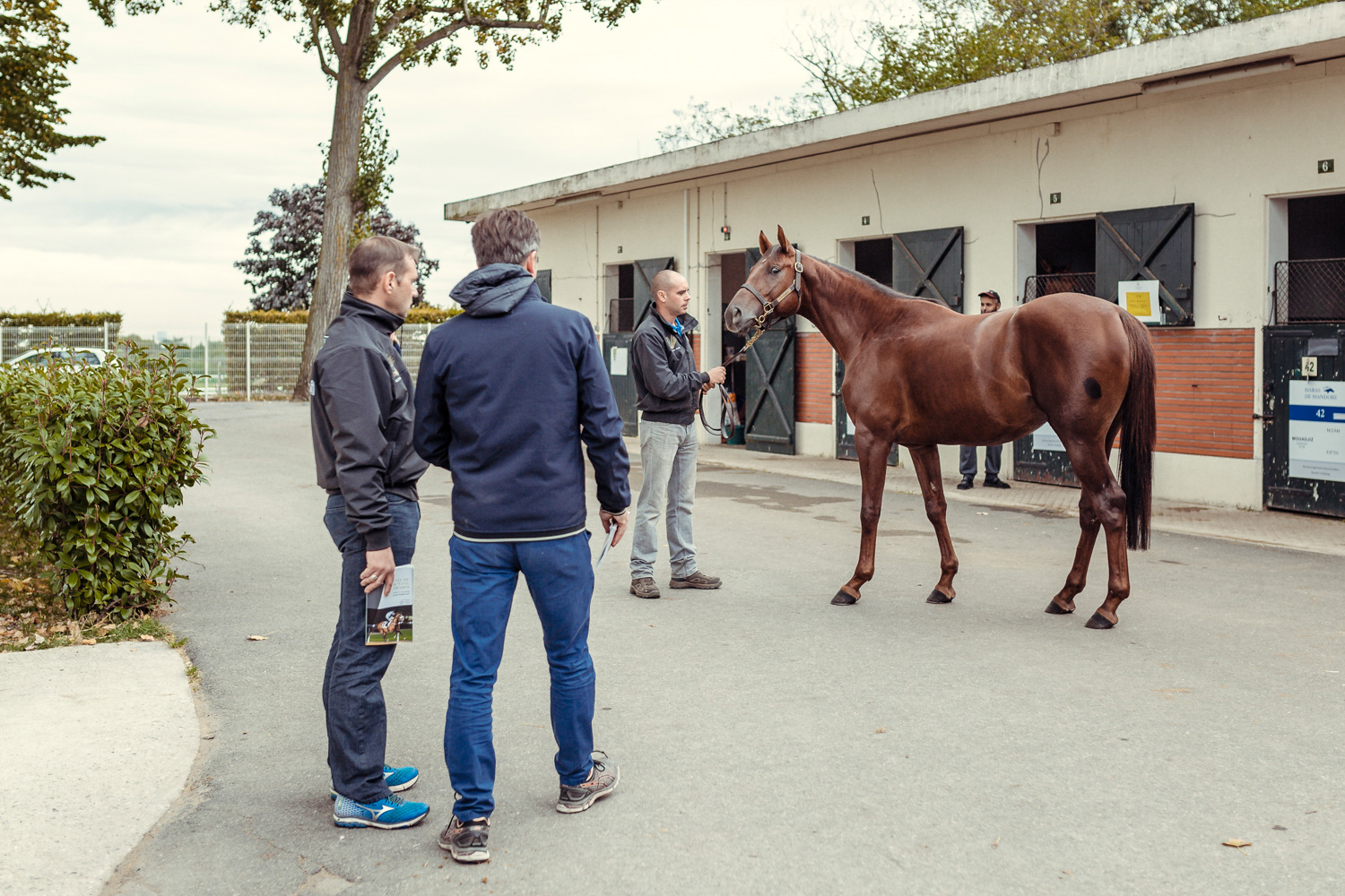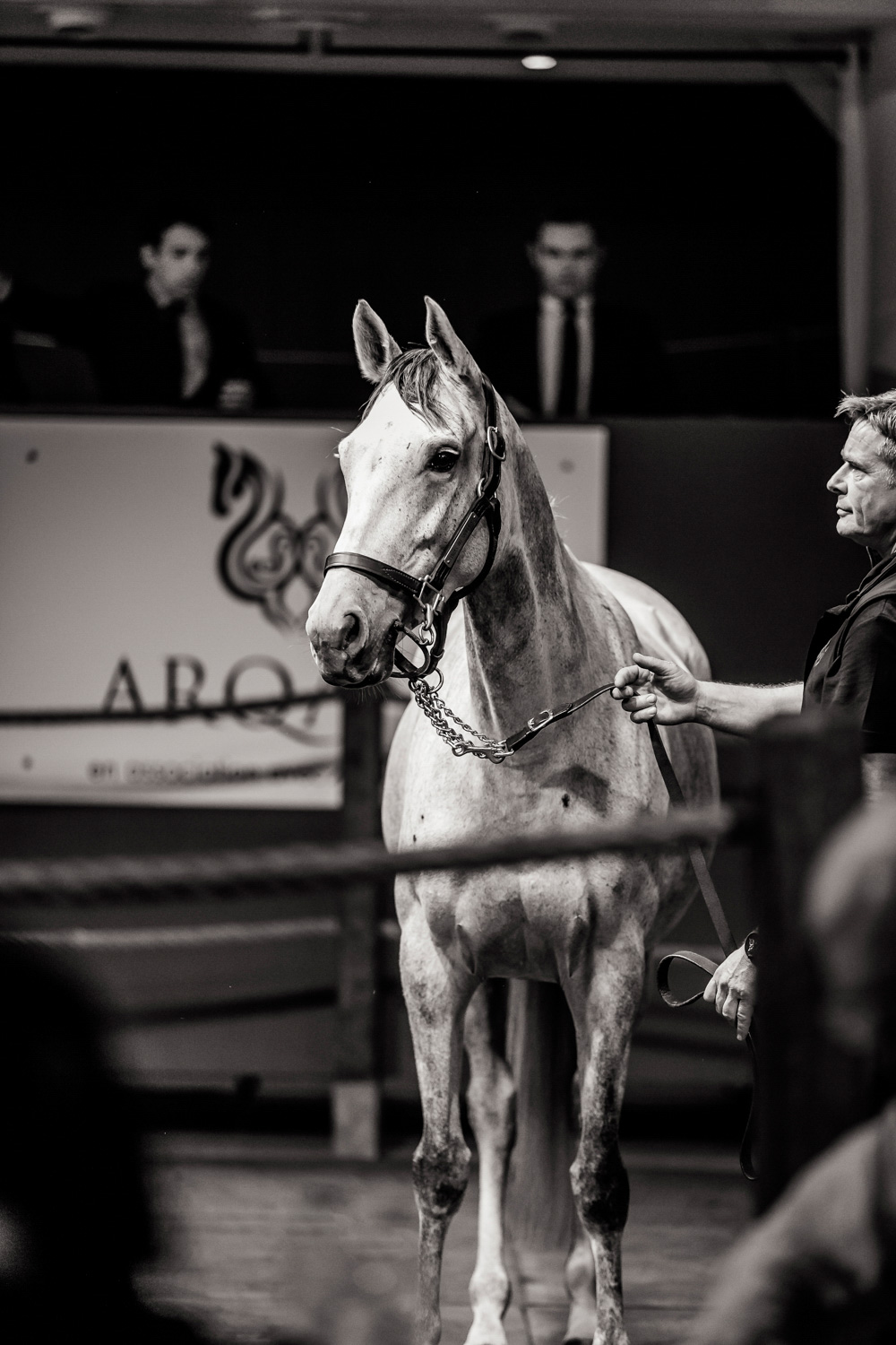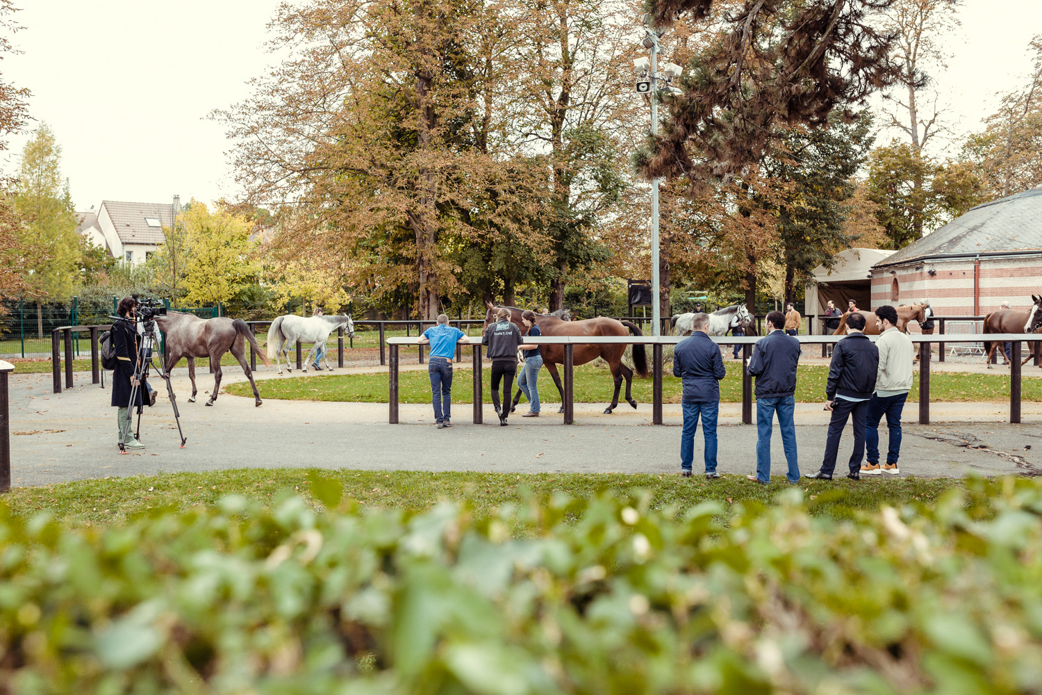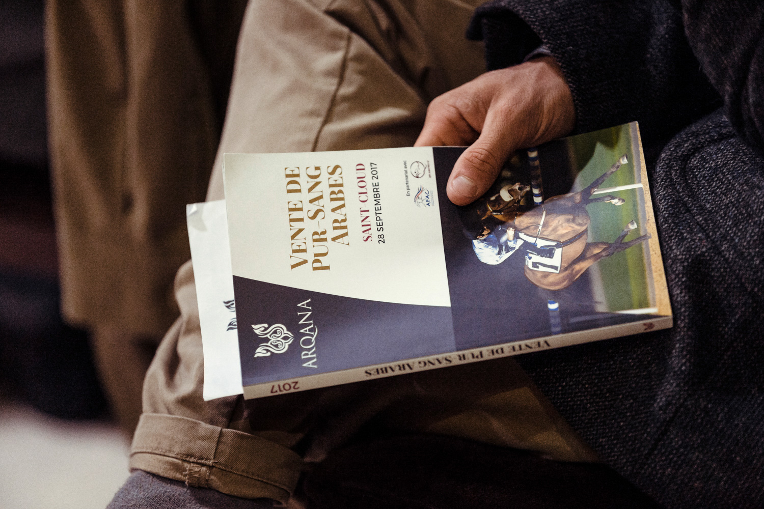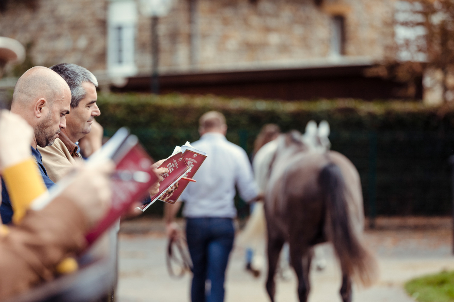 A première vue tout semble paisible. Catalogue sous le bras, stylo autour du cou, téléphone en main, un ballet bien organisé entre éleveurs et futurs acheteurs s’organisent devant moi. L’ambiance est sérieuse et studieuse. Tout à coup, un potentiel acheteur fait signe à la personne responsable du cheval. Celui-ci lui demande si il peut le voir dehors, afin d’étudier les jambes (du cheval bien sûr) et de le voir marcher. Une fois chose faite, il inscrit ses remarques dans son catalogue et va voir le ou les suivants qui ont capté son attention lors des galops. ambiance, relation, détail, une partie de mon travail photographique s’articule autour de cet axe.