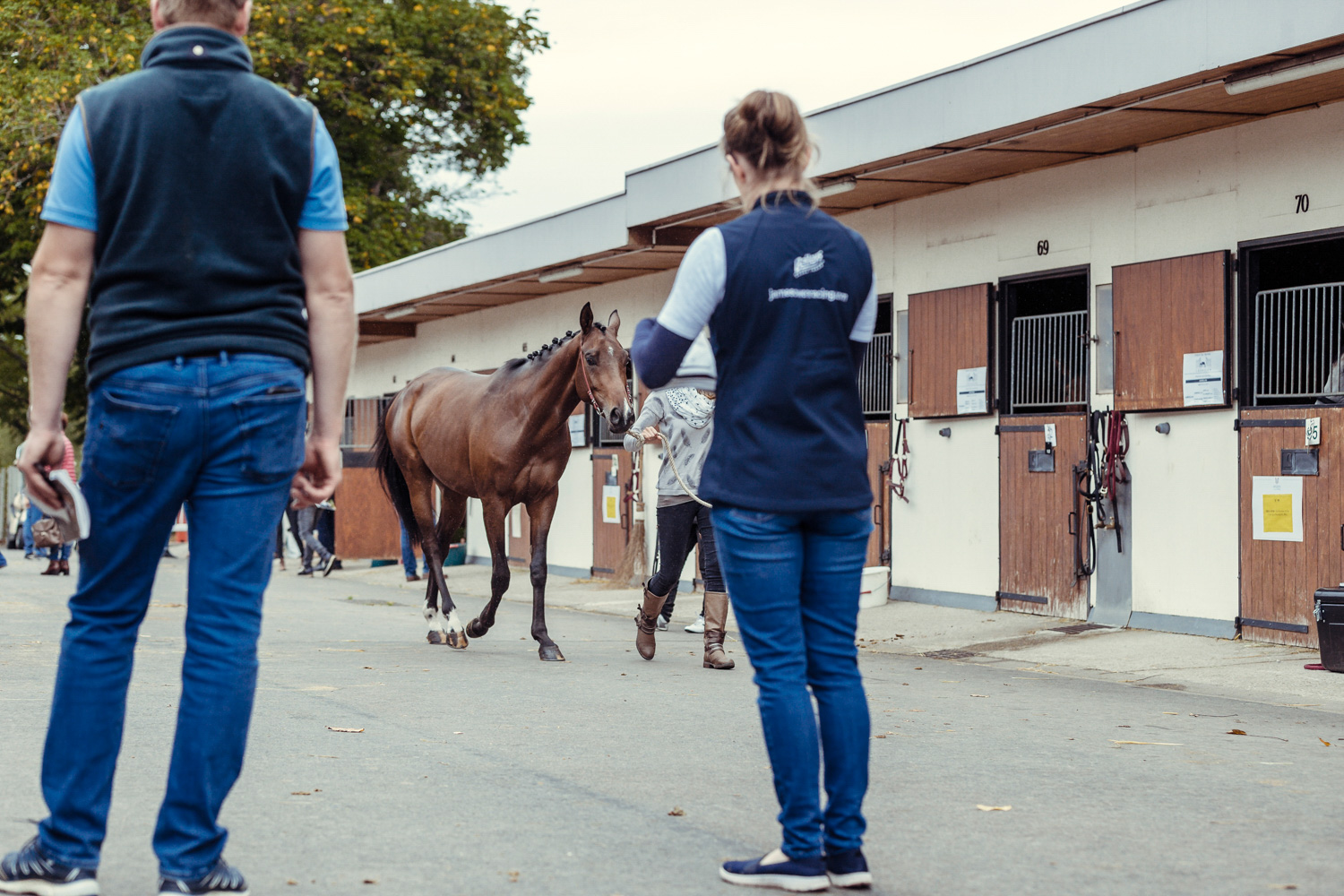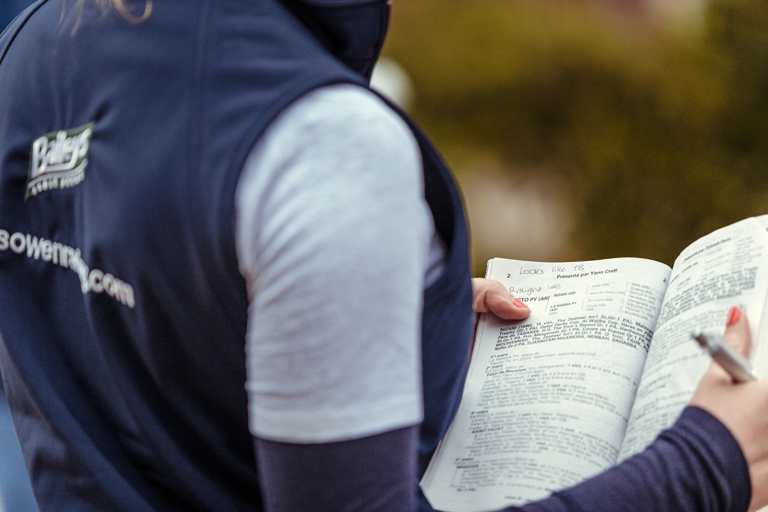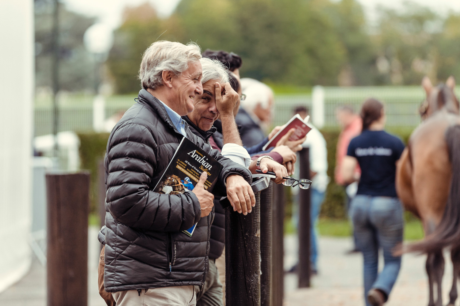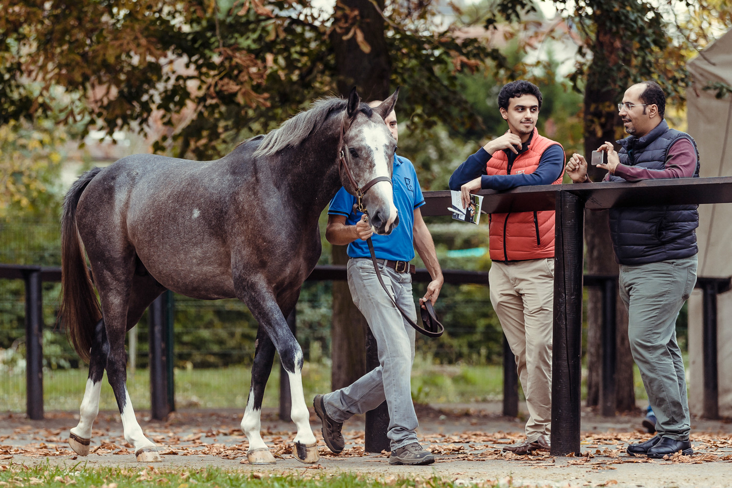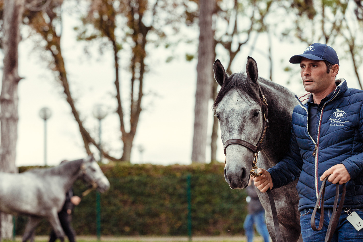 A première vue tout semble paisible. Catalogue sous le bras, stylo autour du cou, téléphone en main, un ballet bien organisé entre éleveurs et futurs acheteurs s’organisent devant moi. L’ambiance est sérieuse et studieuse. Tout à coup, un potentiel acheteur fait signe à la personne responsable du cheval. Celui-ci lui demande si il peut le voir dehors, afin d’étudier les jambes (du cheval bien sûr) et de le voir marcher. Une fois chose faite, il inscrit ses remarques dans son catalogue et va voir le ou les suivants qui ont capté son attention lors des galops. ambiance, relation, détail, une partie de mon travail photographique s’articule autour de cet axe.