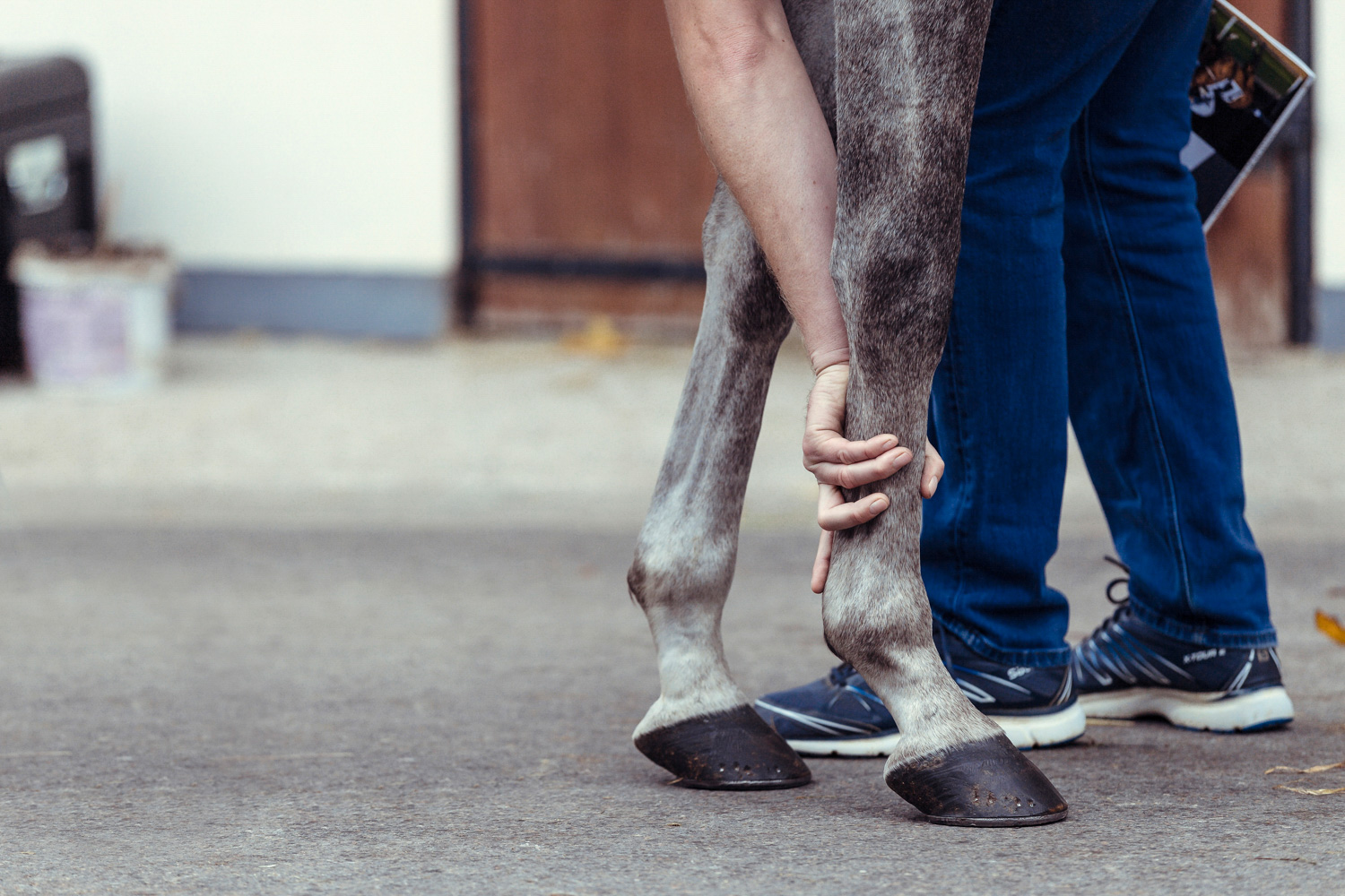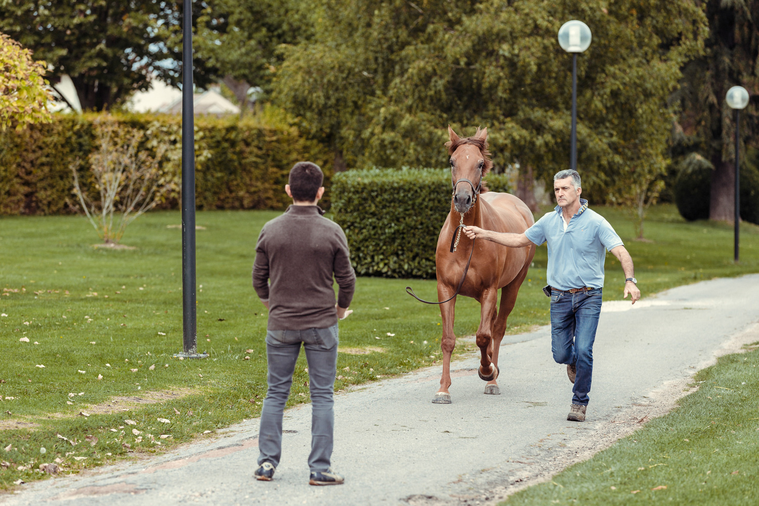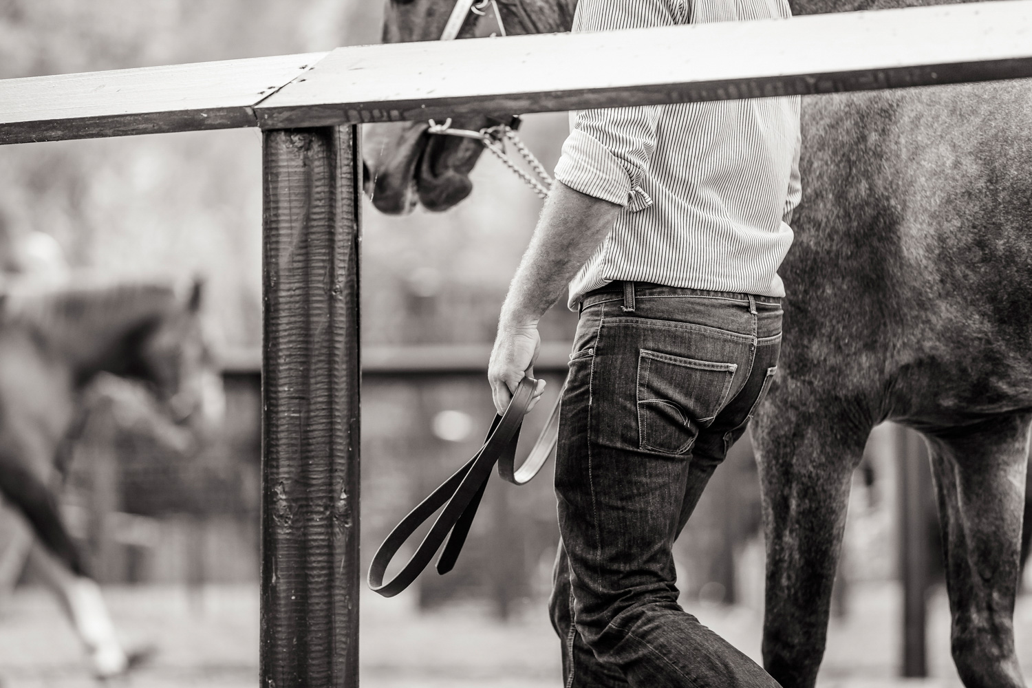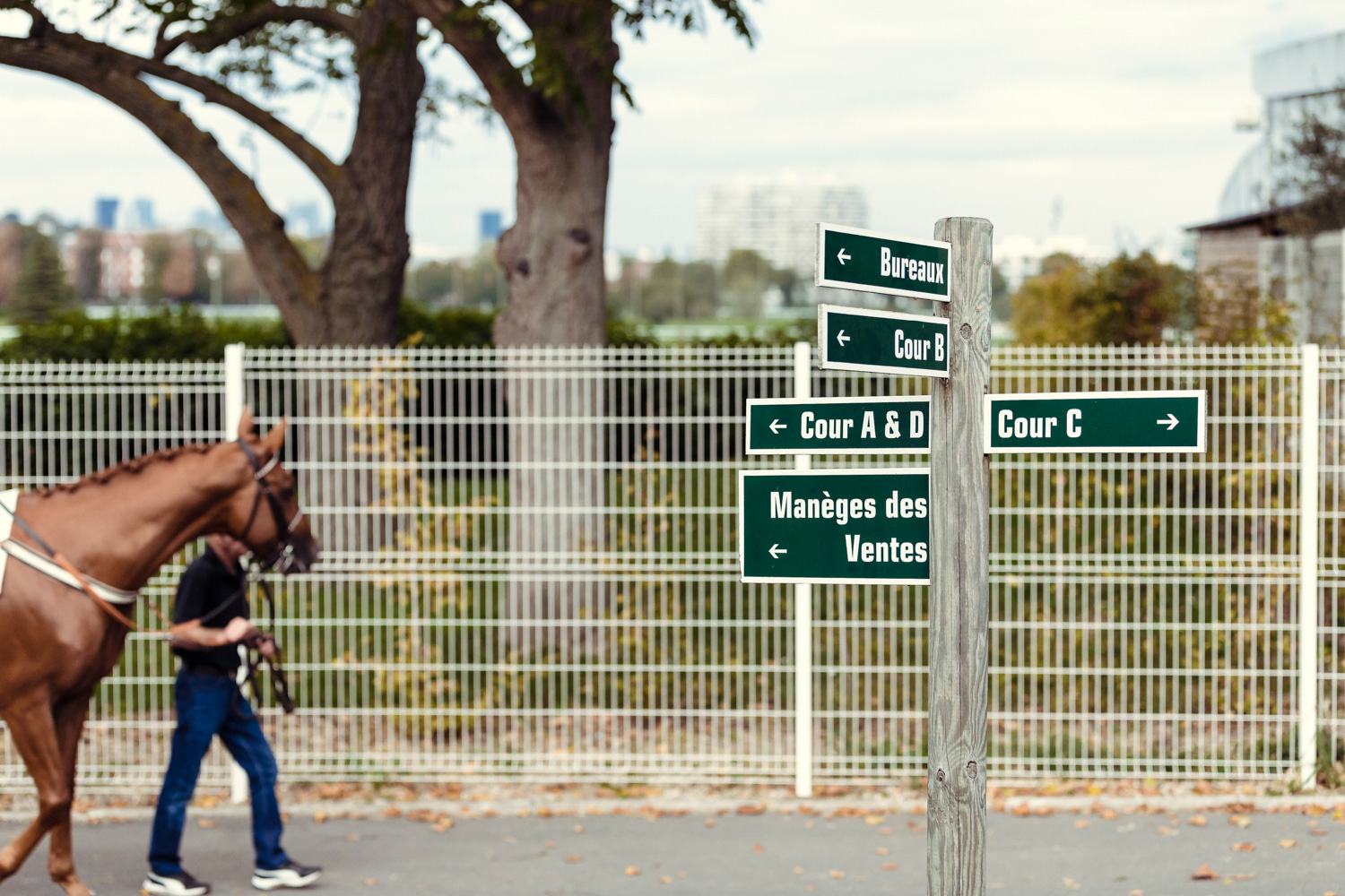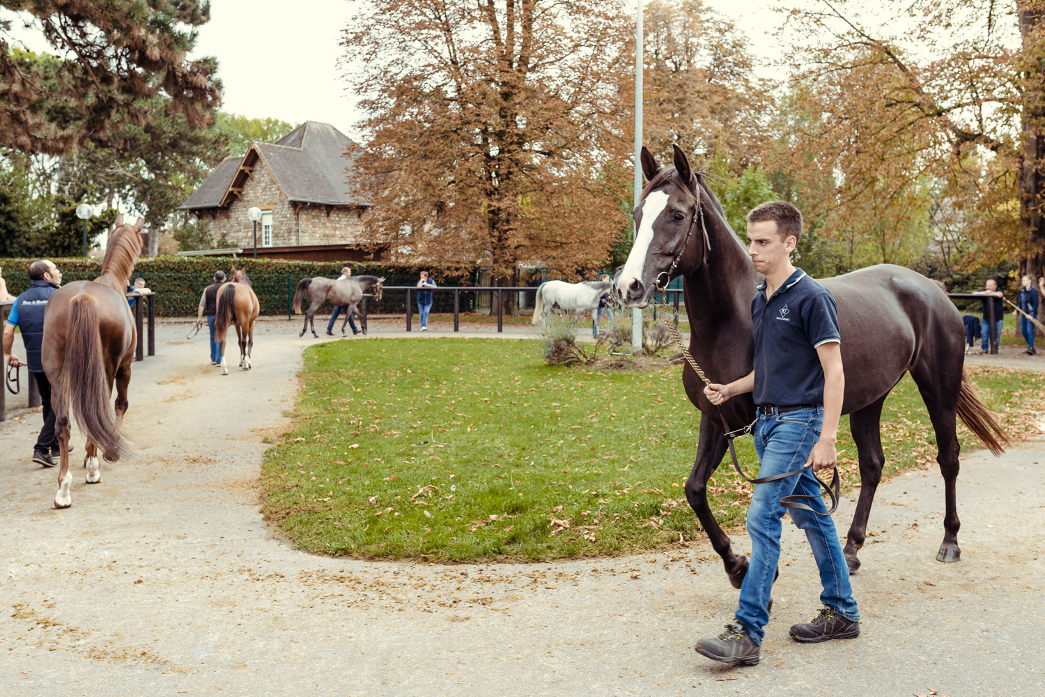 A première vue tout semble paisible. Catalogue sous le bras, stylo autour du cou, téléphone en main, un ballet bien organisé entre éleveurs et futurs acheteurs s’organisent devant moi. L’ambiance est sérieuse et studieuse. Tout à coup, un potentiel acheteur fait signe à la personne responsable du cheval. Celui-ci lui demande si il peut le voir dehors, afin d’étudier les jambes (du cheval bien sûr) et de le voir marcher. Une fois chose faite, il inscrit ses remarques dans son catalogue et va voir le ou les suivants qui ont capté son attention lors des galops. ambiance, relation, détail, une partie de mon travail photographique s’articule autour de cet axe.