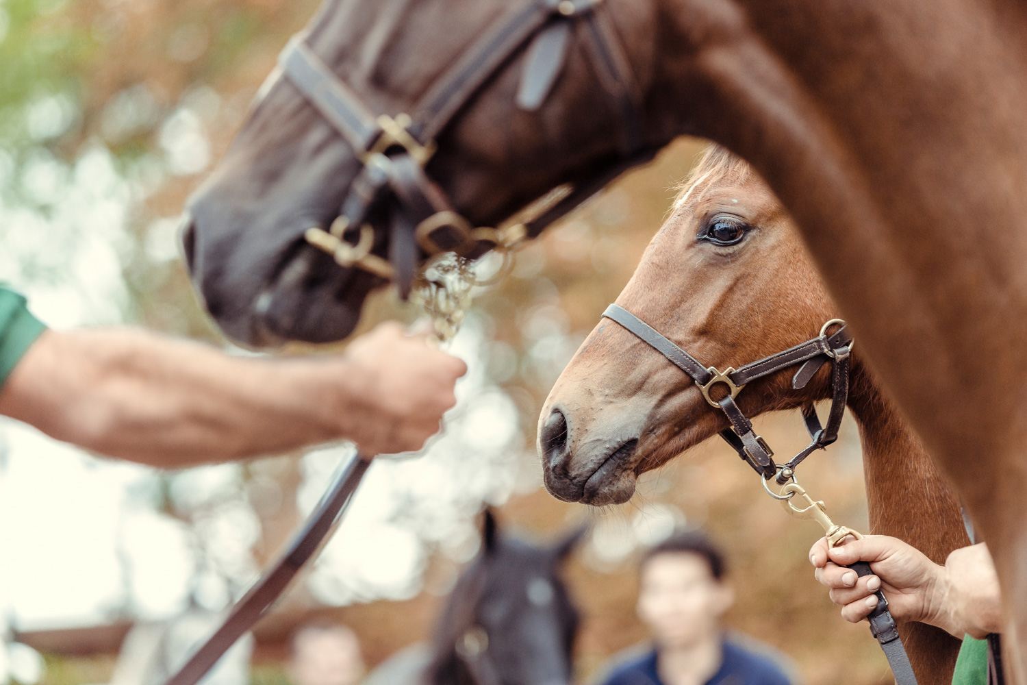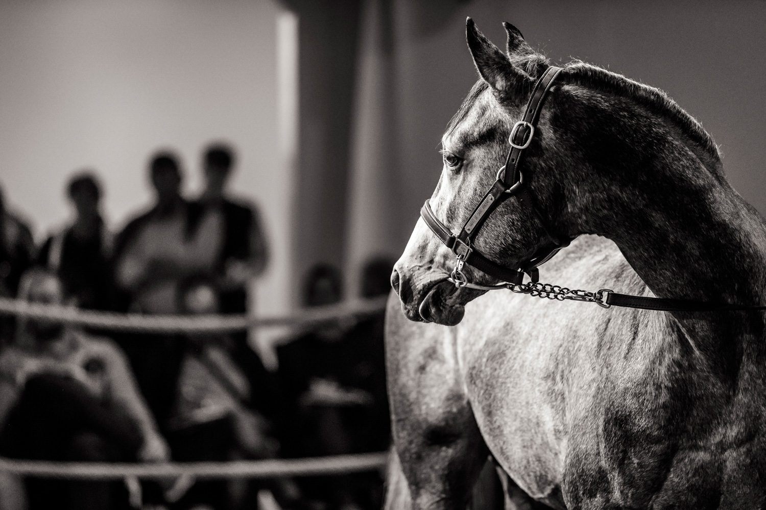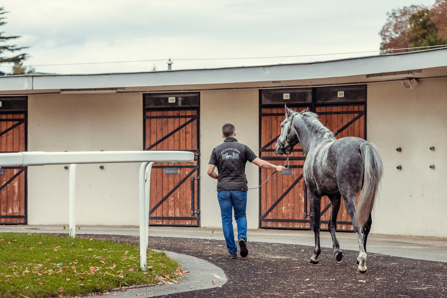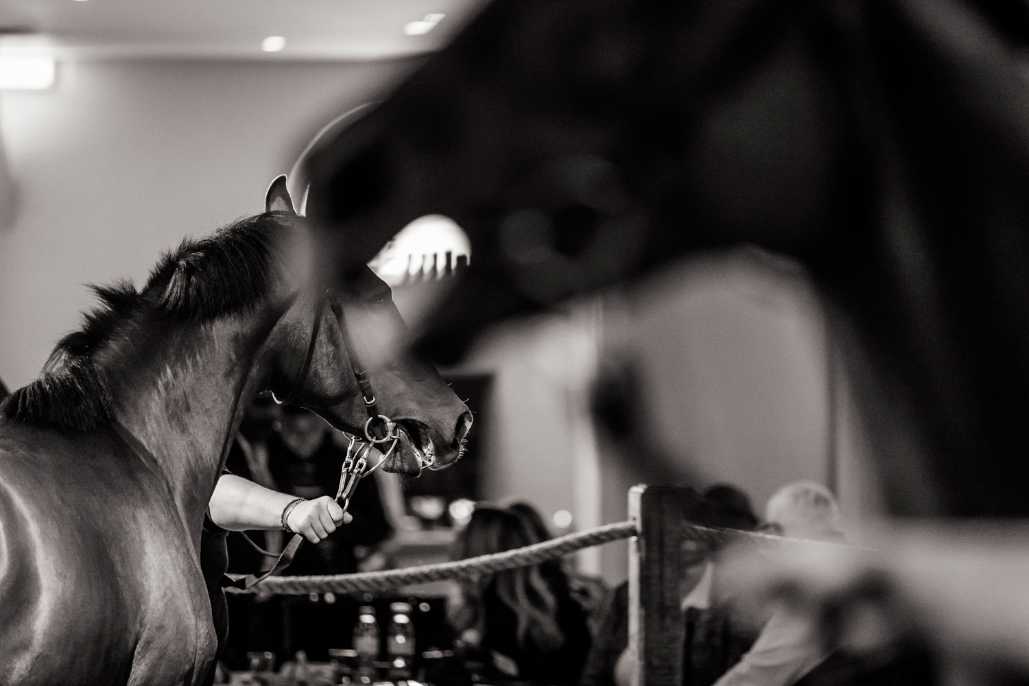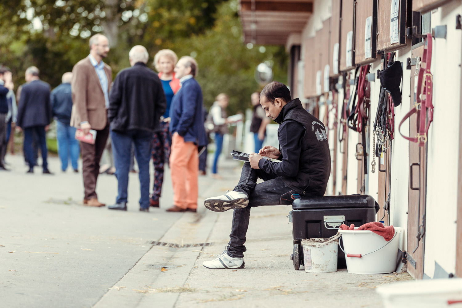 A première vue tout semble paisible. Catalogue sous le bras, stylo autour du cou, téléphone en main, un ballet bien organisé entre éleveurs et futurs acheteurs s’organisent devant moi. L’ambiance est sérieuse et studieuse. Tout à coup, un potentiel acheteur fait signe à la personne responsable du cheval. Celui-ci lui demande si il peut le voir dehors, afin d’étudier les jambes (du cheval bien sûr) et de le voir marcher. Une fois chose faite, il inscrit ses remarques dans son catalogue et va voir le ou les suivants qui ont capté son attention lors des galops. ambiance, relation, détail, une partie de mon travail photographique s’articule autour de cet axe.