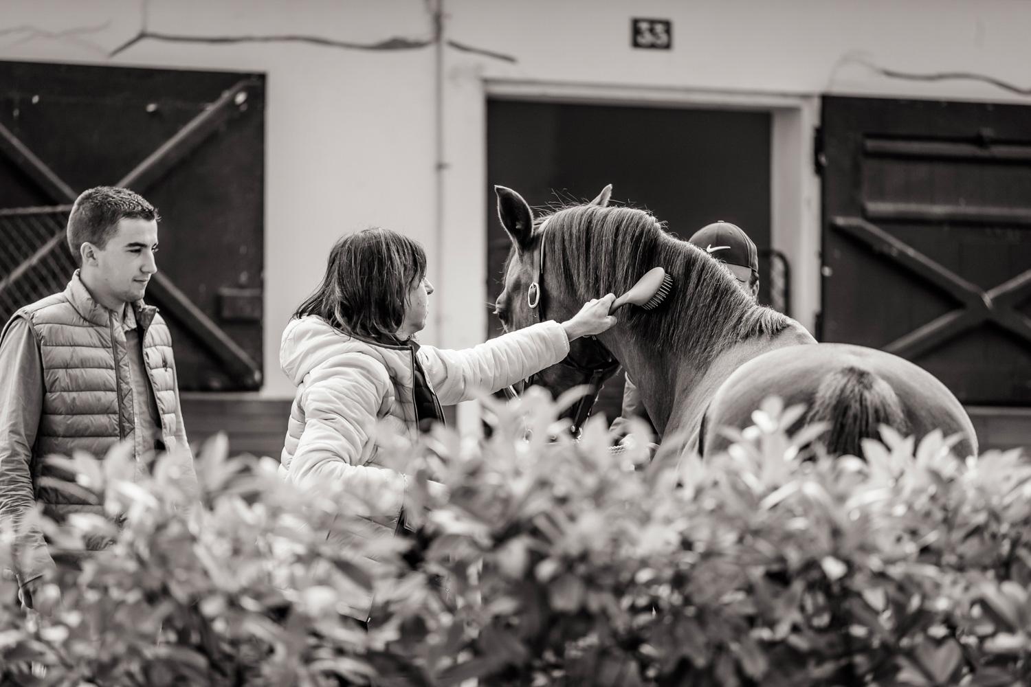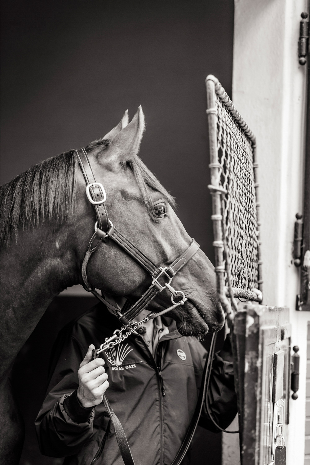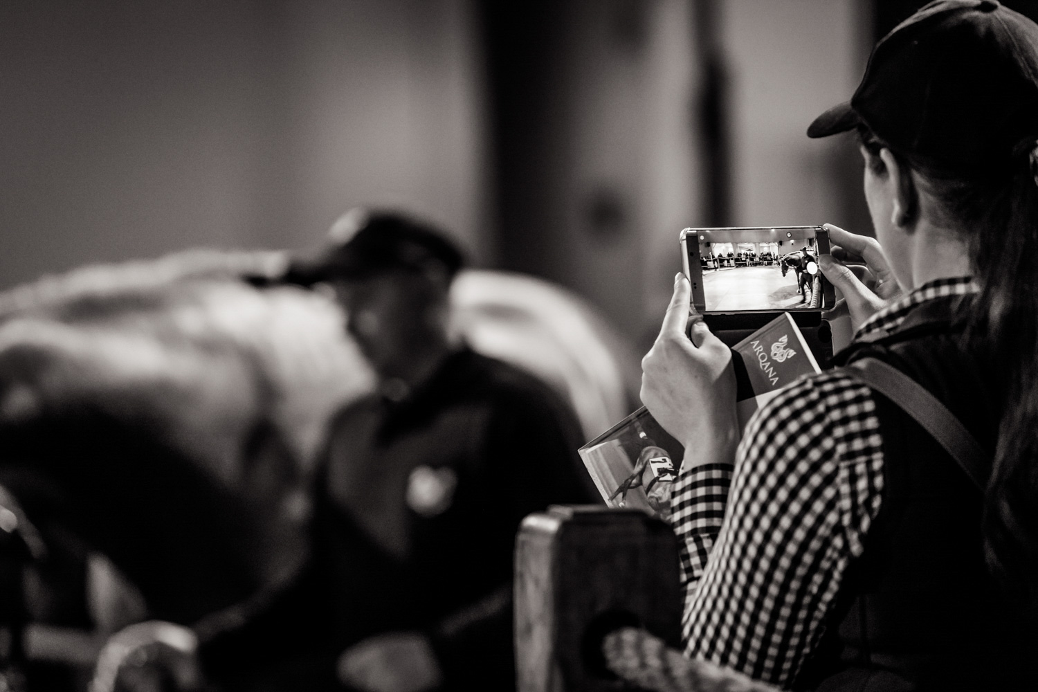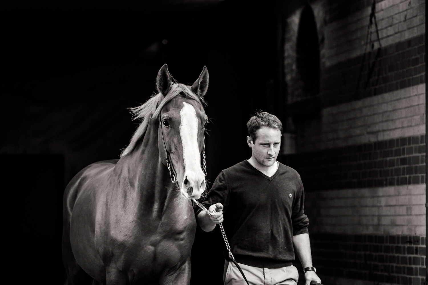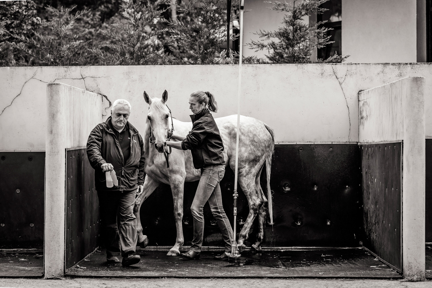 A première vue tout semble paisible. Catalogue sous le bras, stylo autour du cou, téléphone en main, un ballet bien organisé entre éleveurs et futurs acheteurs s’organisent devant moi. L’ambiance est sérieuse et studieuse. Tout à coup, un potentiel acheteur fait signe à la personne responsable du cheval. Celui-ci lui demande si il peut le voir dehors, afin d’étudier les jambes (du cheval bien sûr) et de le voir marcher. Une fois chose faite, il inscrit ses remarques dans son catalogue et va voir le ou les suivants qui ont capté son attention lors des galops. ambiance, relation, détail, une partie de mon travail photographique s’articule autour de cet axe.