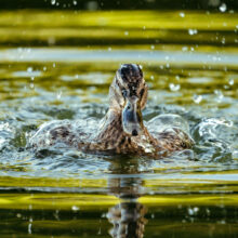 Barbotage d’un colvert surpris un matin d’été. Il apparaît enjoué, le vent-compagnon, poussé sur l’eau ses risées, en vaguelettes, lui donnant pour peu un joyeux air de fête.